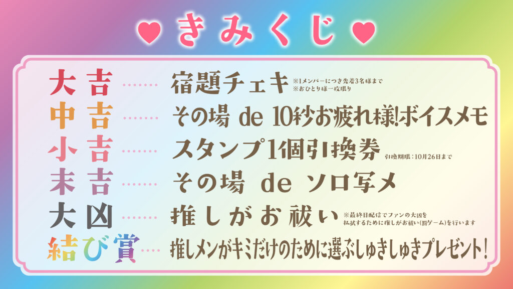 ☆また、大吉と結び賞は手売りの章ごとに更新されますので、例えば第1章で大吉を引いた方も、第2章で追加で推しメンの宿題チェキはゲット可能です!